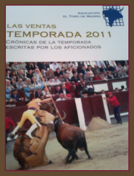 Un año mas y ya van 9, la A. El Toro de Madrid saca a la luz su libro de Crónicas de la temporada, en este caso de la de 2011, de los festejos celebrados en la plaza de Las Ventas, escritas por aficionados miembros de la asociación, que en su mayoría no coinciden con las de los medios llamados oficiales, gustarán mas o menos pero ahí están.Este año se ha elegido para la portada al toro “Aviador” de Cuadri, un ejemplar precioso de estampa , pero con un comportamiento extraño, apretó en varas en algún momento y se repucho en otros e hizo sonar el estribo también y lo mas raro es que salió en estampida hacia las tablas, como diría el otro , raro, raro, raro, un manso con poder que a la mayoría nos dejó perplejos y que puso al valiente torero A. Aguilar en apuros. Foto de portada: Andrés Muñoz Foto de campo: Juanjo José Matute. Nota: quiero dedicar este post a mis amigos Juanjo y Raquel y a su hija Leire, recién nacida , a la que deseo una larga y feliz estancia en este mundo de locos. |